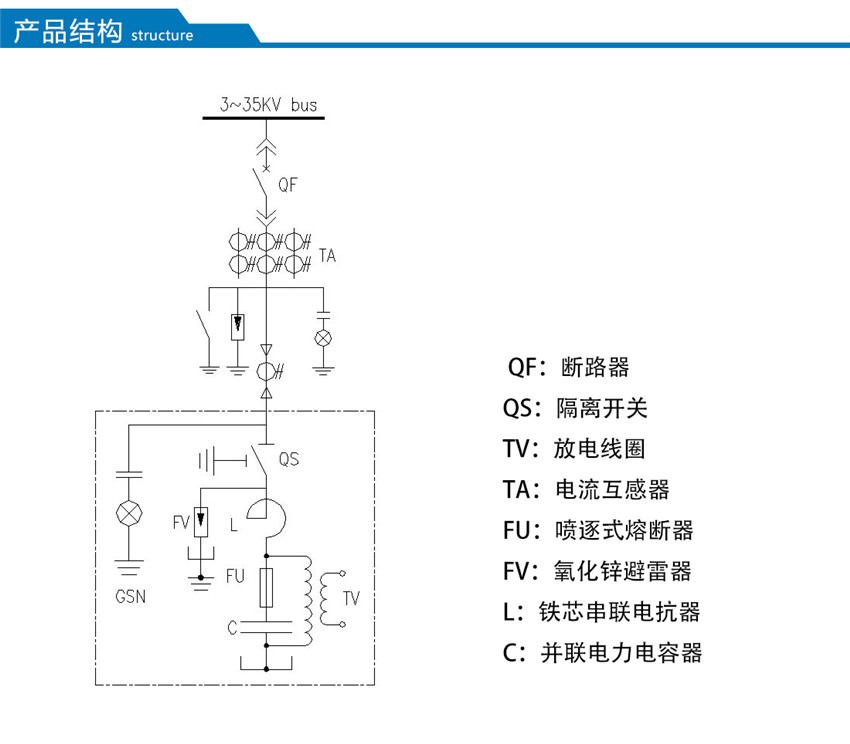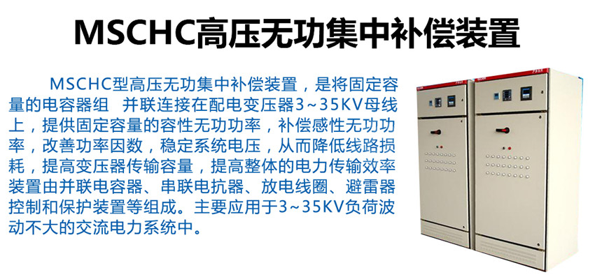 MSCHC型高壓無功集中補(bǔ)償裝置,是將固定容量的電容器組 并聯(lián)連接在配電變壓器3~35kV母線上,提供固定容量的容性無功功率,補(bǔ)償感性無功功率,改善功率因數(shù),穩(wěn)定系統(tǒng)電壓,從而降低線路損耗,提高變壓器傳輸容量,提高整體的電力傳輸效率。裝置由并聯(lián)電容器、串聯(lián)電抗器、放電線圈、避雷器、控制和保護(hù)裝置等組成。主要應(yīng)用于3~35kV負(fù)荷波動(dòng)不大的交流電力系統(tǒng)中