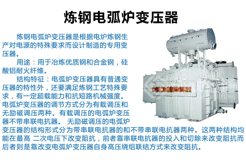 電弧爐變壓器具有普通變壓器的特性外,還要滿足煉鋼工藝特殊要求,有一定超載能力和抗短路機(jī)械強(qiáng)度。電弧爐變壓器的調(diào)節(jié)方式分為有載調(diào)壓和無勵(lì)磁調(diào)壓兩種。有載調(diào)壓的電弧爐變壓器不帶串聯(lián)電抗器。 無勵(lì)磁調(diào)壓的電弧爐變壓器的結(jié)構(gòu)形式分為帶串聯(lián)電抗器的和不帶串聯(lián)電抗器兩種。這兩種結(jié)構(gòu)均能在高 二次電壓下改變阻抗,前者靠串聯(lián)電抗器的投入和切除來改變阻抗,而后者則是靠改變電弧爐變壓器自身高 壓繞組聯(lián)結(jié)方式來改變阻抗。