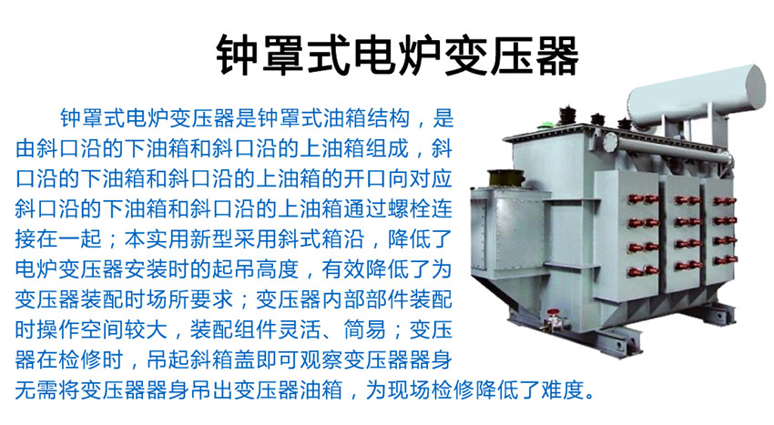 電爐變壓器斜鐘罩式油箱結(jié)構(gòu),是由斜口沿的下油箱和斜口沿的上油箱組成,斜口沿的下油箱和斜口沿的上油箱的開口向?qū)?yīng),斜口沿的下油箱和斜口沿的上油箱通過螺栓連接在一起;本實用新型采用斜式箱沿,降低了電爐變壓器安裝時的起吊高度,有效降低了為變壓器裝配時場所要求;變壓器內(nèi)部部件裝配時操作空間較大,裝配組件靈活、簡易;變壓器在檢修時,吊起斜箱蓋即可觀察變壓器器身,無需將變壓器器身吊出變壓器油箱,為現(xiàn)場檢修降低了難度。